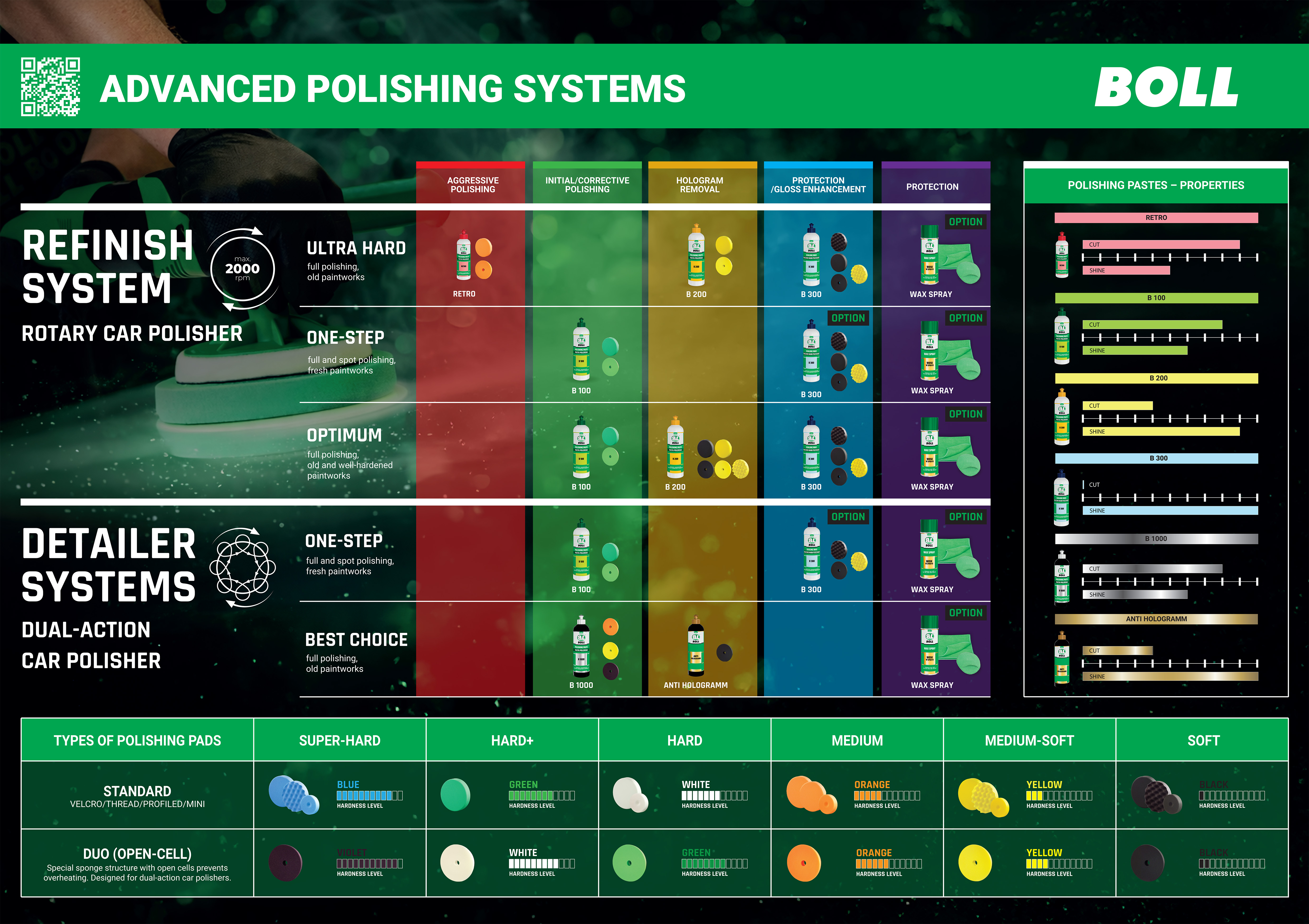 BOLL experts have worked with painters and detailers to develop five recommended BOLL polishing systems. Depending on the equipment you have and the effect you desire, you can choose one of five systems that include the appropriate selection of polishing compounds, pads and polishing stages. The systems are described in the enclosed brochure and in the "Paint Polishing" guide.
